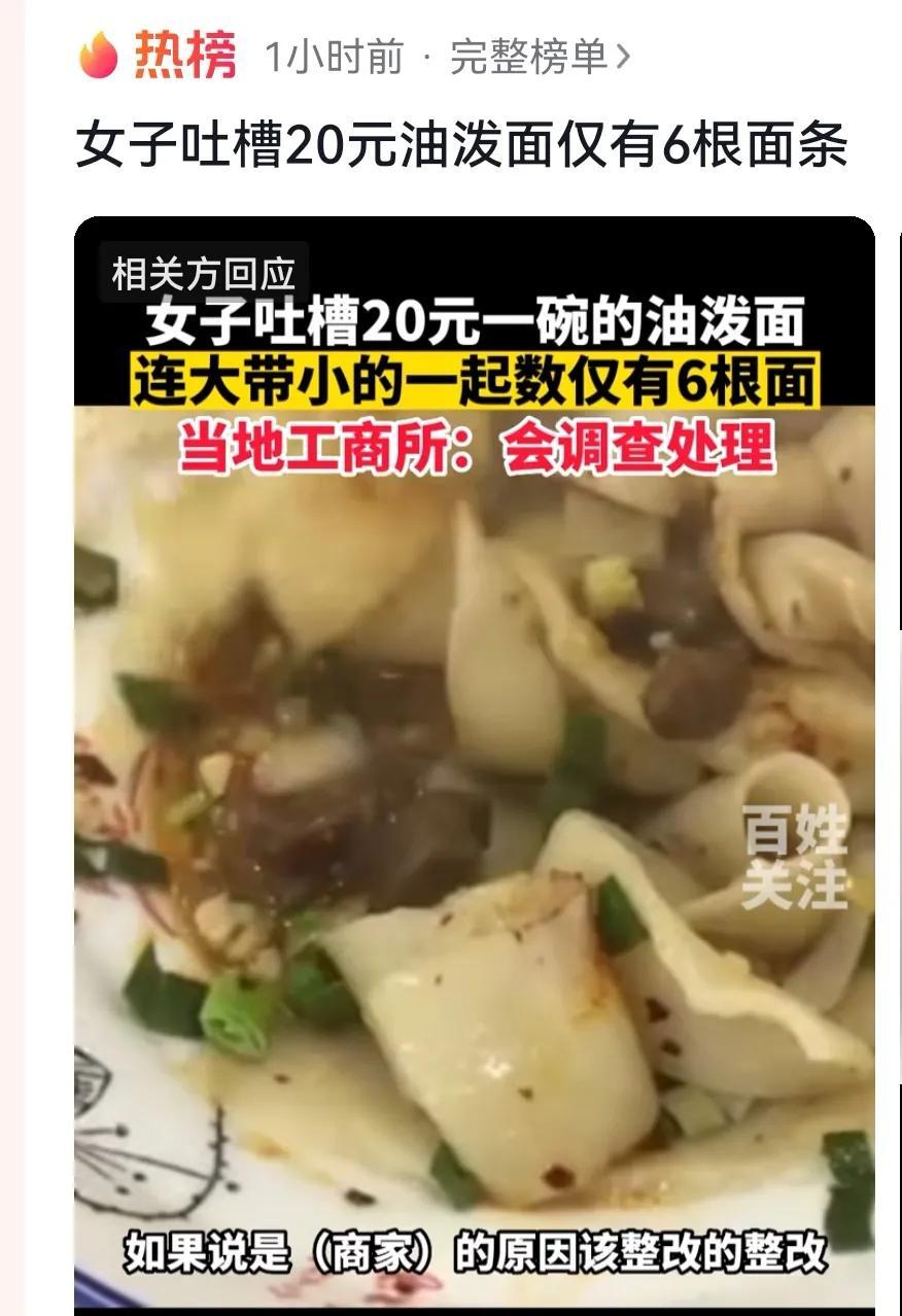 女子吐槽西安20元的油泼面仅六根上热搜。